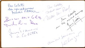 Jean d’Ormesson, Jean Dutourd, Roger Carel, Jean Amadou, Patrick Préjean, Edgar Faure, Jean-Claude Brialy, Bernard Menez, Roger Pierre, Félicien Marceau, Micheline Dax, J.M. Proslier, Marcel Jullian, Jacques Chazot, Jacques Chancel, Claude Piéplu, Thierry Le Luron, Pierre Bellemare, Georges de Caunes, Robert Lamoureux, Line Renaud, etc. On joint 2 cartes a.s. par Jean Charcot et par Germaine Sablon, et 5 photos signées ou dédicacées par André Claveau, Michel Drucker, Léo Marjane, etc.