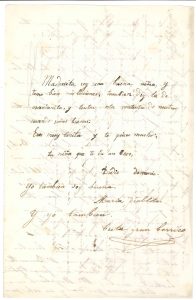 La plus grande partie de la lettre est écrite par la fille aînée Louise « Luisa » (1841-1918) à sa « madrecita querida » : elle s’escrime avec le Concerto de Bach à deux pianos, qui se termine par une fugue comme les aime « el papa Bach » ; c’est une bonne étude pour elle. « Petit Paul », qui s’entraîne à faire le coq, est un vrai perroquet… Au dos, Claudie (1852-1914) assure sa mère qu’elle est une bonne fille, qui apprend bien ses leçons, et lui donne un baiser ; elle signe : « Didie demonio ». Puis Marianne dit qu’elle aussi est bonne, et signe : « Maria diablito » ; suivie par le petit Paul (1857-1941) : « Tutu gran borrico ».