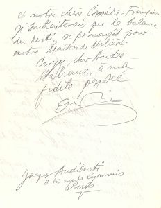 Jacques AUDIBERTI (1899-1965). L.A.S., 30 juin 1961, à André Malraux ; 2 pages in-4.