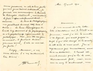 Très belle correspondance philosophique et amicale à un élève puis ami. 1910. 13 avril. La dissertation de Chambon dénote de « sérieuses qualités d’esprit », mais il lui reste à « étendre ces connaissances un peu livresques et à les vivifier par une réflexion plus personnelle et par une philosophie plus directement en contact avec les préoccupations des intelligences et des âmes contemporaines ». Chambon est isolé à Grasse, et Blondel lui conseille de lire des revues philosophiques, et des ouvrages « autres que des manuels ou que des livres de vulgarisation »... 17 avril. Il a lu sa dissertation sur la liberté, travail sérieux mais encore un peu trop scolaire ; Blondel lui reproche de traiter ce thème trop dans son ensemble, sans l’approfondir et sans point de vue psychologique et subjectif : « vous restez trop dans la perspective des connaissances conceptuelles ou objectives qui masquent souvent “les données immédiates de la conscience”. Malgré ces imperfections [...] votre dissertation m’a laissé une impression favorable et encourageante. Quant à la question de la Liberté, en Dieu, il n’est pas étonnant qu’elle vous embarrasse après avoir embarrassé les plus grands esprits. Quand je me suis présenté au Baccalauréat à Dijon M. Henri Joly, qui était alors doyen de la faculté de Lettres, nous avait proposé ce sujet qui laisserait perplexe plus d’un candidat actuel : “En quoi consiste le désaccord de St Thomas et de Dun Scot, de Leibniz et de Descartes sur la théorie de la Volonté et de l’Entendement en Dieu ?” – La vraie liberté n’est pas l’indifférence, le libre arbitre, c’est l’accord intime de la raison & de l’activité », etc. 6 juillet. Il confirme l’impression favorable que lui donnent ses dissertations : « ce qui vous manque – et ce qui s’acquiert – c’est une bonne méthode de travail et ce sont des connaissances plus précises, plus étendues. Par le progrès de vos réflexions et de vos lectures, vous arriverez vite à prendre les problèmes philosophiques directement, avec un sens plus vif du concret ; vous vous débarrasserez d’une certaine phraséologie abstraite ; vous vous intéresserez davantage aux questions, quand vous serez plus affranchi des cadres artificiels e superficiels des manuel ».... 25 juillet. La correction du Baccalauréat a retardé sa réponse, mais il propose à Chambon, pour le faire travailler, de lui prêter plusieurs ouvrages ou revues pendant les vacances... 25 octobre. Il l’encourage à continuer ses efforts et à s’habituer à écrire chaque jour « une page ou deux de méditation philosophique [...]. Cet exercice ne fût-il que de 20 ou 30 minutes par jour est extrêmement profitable à tous égards »... 14 novembre. Il se réjouit de causer avec lui « de votre travail & de vos préoccupations philosophiques »... 1911. 20 avril. Il conseille à Chambon de venir à Aix : « la conversation des étudiants, le secours des bibliothèques, les causeries de la conférence vous seront très utiles, pour ne pas dire indispensables », car il semble que sa préparation « reste défectueuse, faute de ressources pour les lectures et d’indications pour vos réflexions personnelles [...]. Et par correspondance il est vraiment impossible d’orienter votre effort, alors que souvent il faut plusieurs mois aux étudiants qui vivent à la faculté pour se rendre compte du travail qu’on leur demande »... 12 novembre. Renseignements sur le « tableau des cours et des conférences » de la prochaine rentrée... 17 juillet 1914. Il le remercie pour ses félicitations. « Vos anciens élèves de Grasse continuent à vous être attachés et à vous faire honneur »... 13 mai 1917. Sa belle-sœur recherche un précepteur de confiance pour ses enfants pendant les vacances... 5 octobre 1921. Il essaie, avec le concours de l’abbé Mulla, de lui trouver « pour l’avenir une situation plus avantageuse et plus stable », avec « une classe laborieuse, intelligente, capable de profiter de votre enseignement »... Les autres lettres sont dictées. 10 janvier [1928]. Il est tout à fait à la retraite, mais « avec une difficulté croissante dans le travail que, par devoir, je poursuis coûte que coûte. En ce moment je suis amené à interrompre un peu mes dictées doctrinales pour corriger les placards des entretiens que j’ai eus avec F. Lefèvre et qui doivent paraître en février » [L’Itinéraire philosophique de Marice Blondel, propos recueillis par Frédéric Lefèvre, 1928]... 9 novembre [1928]. Il a de bonnes nouvelles du cher abbé Mulla « qui a pris une excellente situation et exerce une heureuse influence à Rome » ; il prépare ses cours à l’Institut pontifical oriental... 8 janvier 1929. Il est heureux de savoir Chambon « toujours plein de vaillance laborieuse et d’activité ». L’état de ses yeux ne lui permet plus d’écrire... 10 janvier 1932. « Avec Mgr Mulla qui a passé les fêtes auprès de moi, nous parlions de vous. [...] Nous sommes heureux du poste important qui vous est confié, du succès que vous y obtenez, du bien que vous y faites. Pour moi, de plus en plus infirme, je continue à travailler péniblement, en dictant, sans pouvoir rien lire »... 11 janvier 1933. Il évoque leurs souvenirs de Grasse et Aix, et donne des nouvelle d’anciens élèves qui lui font honneur, tous à des postes importants. « Pour moi, malgré des infirmités accrues, je poursuis une tâche qui sera encore longue mais qui dès cette année pourra aboutir à 2 nouveaux volumes. Il en faudrait encore 3 ou 4 autres pour me décharger du poids intellectuel que je porte en une tête bien lasse et souvent bien douloureuse »... 7 janvier 1935. Il compatit aux attaques contre Chambon, « car durant toute ma carrière, j’ai été logé à cette pénible enseigne. Mais vous faites courageusement votre devoir ». Il donne des nouvelles de sa famille, d