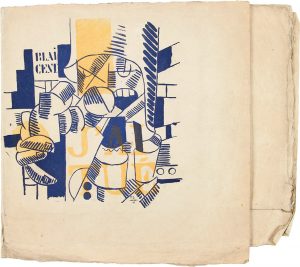 Édition originale, imprimée en rouge par François Bernouard, et ornée de 5 dessins de Fernand Léger, dont 2 hors texte à pleine page en bleu et celle de la couverture rehaussée de jaune au pochoir. Un des 25 exemplaires sur Japon (n° 27) avec une suite des dessins (en noir et non en bleu comme indiqué au justificatif). Envoi autographe signé, au crayon sous le justificatif, numérotés de 3 à 27 », à Misia : « à Madame Edwards respectueux hommages de Blaise Cendrars soldat. novembre 1918 ». [Misia Edwards (1872-1950), bien que divorcée de son second mari Alfred Edwards en 1909, n’épousera le peintre José-Maria Sert qu’en 1920, quittant alors le nom de Mme Edwards pour celui de Misia Sert.]