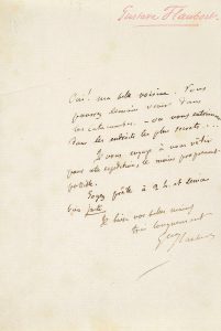 Curieuse lettre inédite. « Oui ! ma belle voisine. Vous pourrez demain venir dans les catacombes. – On vous entraînera dans les endroits les plus secrets... Je vous engage à vous vêtir pour cette expédition, le moins proprement possible. Soyez prête à 2 h. et demie bien juste. Je baise vos belles mains très longuement »... [La belle Jeanne de Tourbey (1837-1908), future comtesse de Loynes, demeurait rue de Vendôme (actuelle rue Béranger), alors que Flaubert habitait boulevard du Temple, de 1856 à 1869. Le 11 mars 1862, Flaubert a visité les catacombes avec les frères Goncourt, qui ne mentionnent pas la présence de Jeanne de Tourbey.]
