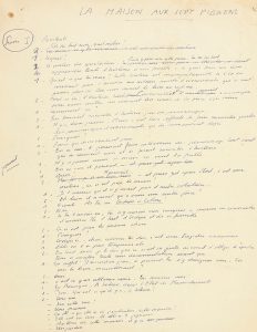 Adaptation radiophonique du roman de Nathaniel Hawthorne, La Maison aux sept pignons (1851), diffusée sur France-Culture le 29 décembre 1966, et recueillie dans les Adaptations théâtrales publiées en 1985 à L’Âge d’Homme à Lausanne. Le manuscrit, d’une petite écriture au stylo bille bleu sur papier jaune, de premier jet avec ratures et corrections, avec des notes et additions en marge, semble correspondre à d’importants développements ajoutés à un premier manuscrit, auquel il renvoie à plusieurs reprises. La Scène I (p. 1-3) est un dialogue parfois ironique entre les deux récitants ; la Scène II (p. 4-9) met en scène au début Holgrave et le petit garçon, puis viennent d’autres personnages ; la Scène III (p. 10-15), « le salon au portrait », commence par un dialogue entre Hepzibah et Phoebé ; la Scène IV (p. 15-16), « L’atelier », termine la 1ère partie. Les deux dernières pages (17-18) donnent la Scène V, avec le début de la 2e partie, avec renvoi final au manuscrit.
