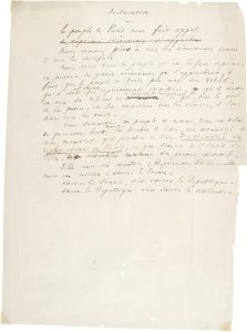 Retour de Victor Hugo à Paris en 1870. Il s’agit ici d’une première version de la déclaration faite par Hugo à son retour à Paris après 19 ans d’exil, au lendemain de la proclamation de la République, et alors que l’armée prussienne marche sur Paris [voir Actes et Paroles III, i, 1 « Rentrée à Paris »]. « Le peuple de Paris nous fait appel. [Rayé : De suprêmes évènements s’approchent.] Nous sommes prêts à tous les dévouements comme à tous les sacrifices. Mais c’est dans le peuple qu’est la force suprême. En présence des graves événements qui s’approchent, il faut que le peuple se fasse pour ainsi dire visible, qu’il élise d’urgence des représentants immédiats, qu’il mette en eux sa volonté et la majesté de la République, et que, dans le péril de la patrie, en leur imposant tous les devoirs, il leur donne tous les droits. Nous demandons au peuple de nommer, dans un délai de quarante-huit heures, au scrutin de listes, une assemblée de cent membres, qui prendra le titre d’assemblée des représentants de Paris, et qui siégera à l’Hôtel de Ville. Cette assemblée nommera son pouvoir exécutif. Elle aura un mandat : Représenter Paris. Elle aura une mission : sauver la France. Sauver la France, c’est sauver la République. Sauver la République, c’est sauver la civilisation ».