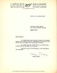 [Pierre LEYRIS (1907-2001) traducteur]. Ensemble d’environ 110 lettres et documents des éditions Gallimard, la plupart L.S., 1952-1995, à lui adressés ; formats divers, la plupart in-4.