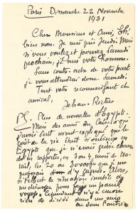 Il reporte un rendez-vous, puis évoque un projet de voyage en Égypte : « Des amis du Caire à qui j’avais écrit m’ont expliqué que le coût de la vie était si onéreux en Égypte que je n’avais guère chance d’en rapporter, en 3 ou 4 mois de travail, les 20 ou 30.000 frs que je me proposais d’y gagner. Alors, si telle est la situation, inutile de me déranger pour faire un pareil voyage »... Il n’y a pas eu de suite à sa demande auprès de Jean Vignaud pour le recommander à la personne qui choisit les dessins au Petit Parisien : « Ca me ferait une corde de plus à mon arc que donner de temps à autre un dessin d’actualité humouristique au Petit Parisien »...