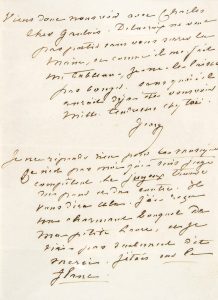 « Viens donc nous voir avec Charles [Duvernet] cher Gaulois. Delacroix ne veut pas partir sans vous serrer la main, et comme il me fait un tableau [L’Éducation de la Vierge], je ne le laisse pas bouger. Sans quoi il aurait déjà été vous voir. […] Je ne réponds rien pour la musique. Ce n’est pas moi qui suis juge compétent. Le jugeux [Chopin] trouve du pour et du contre. Il vous dira cela. J’ai reçu un charmant bouquet de ma petite Laure, et je n’ai pas seulement dit merci. J’étais sur le flanc ». Lettres retrouvées, 25.