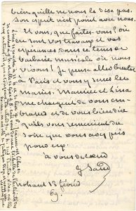 Au sujet d’une domestique. « Mon cher enfant, vous vous êtes donné bien de la peine pour nous avoir une bonne gouvernante […] Mais elle ne remplit pas notre but et ce n’est la faute de personne, pas même la sienne, je pense, car c’est une très douce fille et sans défaut moral que je sache. Mais elle n’est pas douée des aptitudes nécessaires à un ménage bien tenu et à un service régulier et prévu. Elle n’est pas vive, elle est distraite, elle n’aime pas je crois ce genre de fonctions ou elle n’en a pas la force, ou elle n’aime pas à se donner un peu de peine enfin elle n’y arrive pas, et pour le prix que nous lui donnons, nous aurions deux bonnes du pays qui ne feraient ni mieux ni pire. Nous avons voulu lui donner le temps de se retourner, de s’essayer et de s’habituer, et le temps n’a amené aucun progrès. […] Nous lui donnerons tout le temps nécessaire pour se placer bien, et si, de votre côté vous trouvez une bonne place pour elle, agissez. Nous n’aurons que d’excellents témoignages à donner de son caractère, de sa délicatesse et de son travail de femme de chambre proprement dite. Le rangement, le service de table, le coup de balai et le plumeau ne sont pas son affaire, c’est une demoiselle. Si elle ne l’était pas chez vous, elle l’est devenue, et elle peut très bien trouver son emploi sur ce pied dans une maison riche. Nous n’avons pas cet emploi chez nous, où il faut être un peu à tout »… Puis Sand s’enquiert : « Et vous que faites-vous ? Où en sont vos travaux et vos espérances dans ce temps de barbarie musicale où nous vivons ? »… Elle ajoute, à propos de sa belle-fille Lina et de la bonne : « Lina se couche à 11 h. et se lève à 6. Jeanne est libre de se coucher à 9 h. et elle se lève à 8. […] Lina est très bonne, mais elle se fatigue trop, et nous ne voulons pas »…. Correspondance, XXI, 14135.