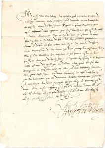 « Jay entendu quil y a certain propos de mariage commencé entre le lieutenant general de Urtube [Urtubie ?] et ma damoiselle de Sassay niepce de vostre femme lequel je serois daultant plus ayse veoir effectuer que led. lieutenant qui est de mes serviteurs demeureroit obligé et lyé de vous fere service et aux vostres en tout ce [que] le debvoir de son estat luy pourroit permettre ». Il prie donc Sarlabos de favoriser cette union, « comme de chose qui me viendra a bien grand plaisir »...