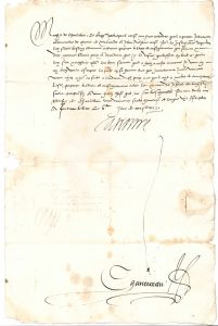 CATHERINE DE MEDICIS (1519-1589). L.S., Fontainebleau 6 août 1571, à Corberan de Cardillac, sieur de Sarlabos, chevalier des « ordres du Roy monsieur mon filz » et gouverneur du Havre de Grâce ; contresignée par son secrétaire d’État...