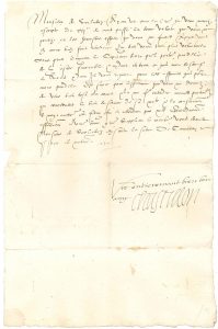 Ayant vu par sa lettre la bonne volonté qu’il lui porte, « et les honnestes offres que vous me faictes », il lui recommande le capitaine Berre, et « de luy estre favorable et aydant en tout ce quil aura besoing de vous et dont il vous requerra pour les affaires quil pourra avoir pardela »...