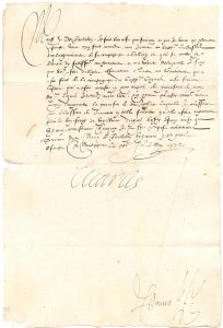 Sur la garnison et la défense du Havre. Montpipeau 26 mai. Il est bien aise que Sarlabos ait fait entendre son intention au capitaine La Bastide sur le cheminement de sa compagnie à Calais. « Quant au licentiement qui a esté faict de la compaignye du Cappne Cazaulx cest suivant lestat qui a esté arresté en mon conseil des garnisons de mon Royaume lequel j’entends avoir lieu, n’y ayant pour ceste cause aucun moyen d’augmenter la garnison de vostre place laquelle je m’asseure ne delaissera de demourer en telle seuretté qu’elle estoit auparavant par le bon soing et vigillance duquel vous y userez »... Paris 20 octobre. « Le Sr de Bacqueville ma faict entendre qu’il envoye au Perou ung navire aluy appartenant soubz la charge du Capitaine Vaufouquet mayant requis laccomoder de deux pieces dartillerie moyennes lesquelles avoient esté prestées a ung nommé Guillaume Hallay pour faire le mesme voyage, quil a depuys rompu, ce que je luy ay liberallement accordé »... Paris 3 novembre. Apprenant « quil sarme quelques navires es costes d’Angleterre ancores que pour la bonne amytié, qui est entre la Royne dud. pays et moy, je naye aucune occasion destimer que ce soit pour fere aucune entreprise surce qui me concerne, touteffois desirant me tenir sur mes gardes et pourveoir a la seuretté de mes places, et speciallement de la vostre qui mest de grande importance jay advisé augmenter vostre compagnye de cent hommes jusques a deux cens »... Il engage Sarlabos à garder « loeil soigneusement ouvert sur les actions de voz voisins en mettant peine de scavoir et descouvrir leurs desseings »…