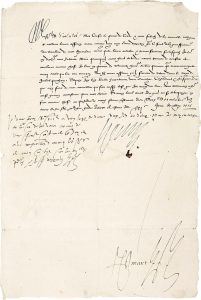 HENRI III. L.S., Paris 21 mai 1575, à Corberan de Cardillac, sieur de Sarlabos, capitaine et gouverneur du Havre de Grâce ; contresignée par le secrétaire d’État Claude Pinart ; 1 page grand in-fol., adresse.