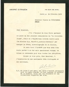 28 février 1928. Il prie les directeurs de succursales, concessionnaires et agents de faire « le meilleur accueil à mon ami » Pierre de Fouquières, Directeur du Protocole, « et d’apporter le plus grand soin à l’exécution des demandes qu’il pourrait être amené à leur faire »… 14 décembre 1933, à Pierre de Fouquières, lui envoyant La Croisière Jaune, « récit de l’Expédition Citroën Centre-Asie […] par Georges Le Fèvre, historiographe de la Mission. Je sais tout l’intérêt que vous avez bien voulu porter à ce dur mais passionnant voyage »…