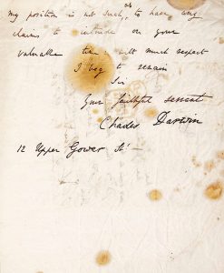 Charles DARWIN (1809-1882) naturaliste anglais. L.A.S., Londres 14 octobre 1841, à Joseph Gaimard, à Paris ; 2 pages et demie in-4, adresse ; en anglais (papier froissé, taches).