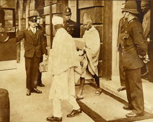 Photographie de presse originale, avec le cachet au dos de Planet News Ltd. Elle représente Gandhi quittant le palais de Saint-James où il avait assisté à la deuxième Round Table Conference à propos des réformes constitutionnelles en Inde (7 septembre-1er décembre 1931), sous l’œil des policiers ; Gandhi a signé sur le paillasson sur lequel il marche.