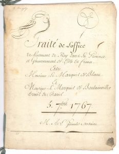 Acte de vente de l’office de lieutenant du roi en Île de France (actuelle région parisienne), entre François Bonaventure de Tilly, marquis de Blaru, et Anne Gabriel Henry Bernard, marquis de Boulainvilliers. Il a été établi par Girauld, et contresigné par Dupré, tous deux notaires au Châtelet de Paris. Cette charge avait appartenu au père du marquis de Blaru, Charles de Tilly, mort en 1724. Son fils François-Bonaventure en hérita mais n’en exerça pas les fonctions. Ayant décidé de revendre cet office, il en régla les droits en avril 1766 et se fit représenter par l’un de ses parents, l’abbé de Tilly, vicaire général du diocèse de Narbonne, pour le céder au marquis de Boulainvilliers, « moyennant la somme de dix sept mille livres ». La suite de l’acte concerne le partage du produit de cette vente entre François-Bonaventure et les autres cohéritiers : sa belle-sœur Henriette Anne Le Roux, veuve de Hilaire de Tilly, et sa sœur Charlotte de Tilly, veuve de Danicau d’Annebault. Après l’acte proprement dit se trouvent enregistrées les quittances des versements effectués par Boulainvilliers, en règlement de l’office de lieutenant du roi. [Issu d’une ancienne famille de la noblesse normande, François-Bonaventure de Tilly, marquis de Blaru (1701-1775) était gouverneur de Vernon, lieutenant général des armées du roi, lieutenant de ses gardes du corps et commandeur de l’ordre de Saint-Louis. Quant au marquis de Boulainvilliers (1724-1798), seigneur de Passy, il fut conseiller du Roi, président au Parlement, lieutenant du Roi puis gouverneur de l’Ile de France. Il était aussi prévôt de la ville, prévôté et vicomté de Paris, poste qu’il occupa jusqu’en 1792.]