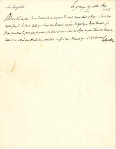19 octobre 1820, au député Alexandre Méchin, à Paris. « Mon fils a fait votre commission auprès de moi, mon cher collegue, il n’est pas aussi facile de faire celle que vous me donnés auprès de quelques departements ; j’y ferai pourtant le peu que je puis, et je vous ecrirai sur cet objet aujourd’hui ou demain »… 27 juillet 1827, au Dr Mège, à Paris. « Je suis loin de penser que la liberté puisse être sauvée dans la Chambre actuelle des deputés, mais la manifestation d’opinion, la marque de confiance des électeurs de l’arrondissement de Meaux, et l’assentiment des patriotes des autres departements m’ont vivement touché. Je pense comme vous que le peuple connaît mieux ses droits »… On joint une L.A.S. de son fils, George Washington de Lafayette, au Dr Mège, Paris 9 janvier 1827.