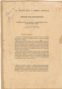 Octave MEYNIER (1874-1961) général et explorateur. Manuscrit signé, La France dans l’Afrique centrale. Mission Joalland-Meynier, 1902 ; 52 pages in-4 montées sur ff. in-fol. (les p. 1-8 impr. avec corrections autogr., les p. 9-58 mss dont la...