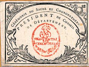 [NAPOLÉON Ier]. 2 cartes d’invitation à la Cérémonie du Sacre et Couronnement (2 décembre 1804) ; 2 cartes in-16 impr. recto-verso, avec le cachet encre du Grand Maître des Cérémonies.