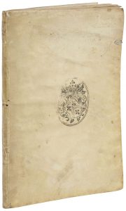 LIPSE (Juste){CR}De Amphitheatro liber. In quo forma ipsa Loci expressa, & ratio spectandi. {CR}Anvers : de l’officine de Plantin, chez Joannes Moretus, 1598. — In-4, 77 pp., (3 ff.), 2 planches. Vélin souple, armes au noir de fumée au...