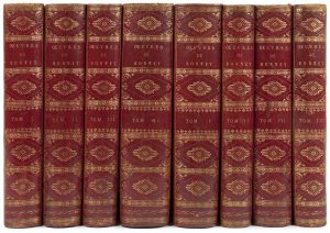 xiv pp. chiffrées xvj, 579 pp., (1 f.) ; (2 ff.), xx, 396 pp. (2 ff.), 502 pp., (1 f.) ; (2 ff.), iv, 395 pp., (2 ff.), 412 pp., 8 planches ; (3 ff.), xxiv, 425 pp. chiffrées 427 ; (2 ff.), ii, viij, 698 pp. ; xiv pp., (1 f.), x, 509 pp. Demi-maroquin rouge à long grain à coins, dos lisse orné, non rogné (reliure du début du XIXe siècle). {CR}Édition collective en partie originale des œuvres du philosophe et naturaliste genevois Charles Bonnet (1720-1793), donnée par l’auteur et contenant de nouvelles préfaces et de nombreuses additions. {CR}Un des rares exemplaires de l’édition en 8 volumes au format in-4, le tirage courant ayant paru en 18 volumes in-8. Elle se décompose ainsi : {CR}Tome 1 (1779) : Traité d’Insectologie. Observations diverses sur les insectes. - Tome 2 (1779) : Mémoires d’Histoire Naturelle. Recherches sur l’usage des Feuilles. - Tome 3 (1779) : Considérations sur les Corps organisés. - Tome 4 (1781) : Contemplation de la Nature. - Tome 5 (1781) : Écrits d’Histoire Naturelle. - Tome 6 (1782) : Essai analytique sur les Facultés de l’Ame. - Tome 7 (1783) : La Palingénésie Philosophique. - Tome 8 (1783) : Essai de Psychologie et Écrits divers. {CR}L’édition est illustrée de 10 vignettes de titres (il y a 2 titres dans les tomes IV et V), de 18 vignettes dont 15 en-têtes et 3 culs-de-lampe et de 58 planches dépliantes soit 16 dans le tome 1, dont 2 tableaux, 34 dans le tome 2 et 8 dans le tome 5. Les vignettes ont été gravées par Bradt. Il manque le portrait de l’auteur remplacé par un autre gravé par Schule d’après Clémens, daté de 1821 et resté volant. {CR}Très bel exemplaire, à toutes marges, en demi-maroquin du tout début du XIXe siècle. {CR}Frottements d’usage aux coiffes et aux coins. Quelques rousseurs et feuillets brunis.