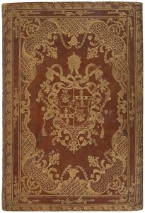 feuillages et d’une dentelle aux petits fers avec compartiments à motifs d’écailles et de losanges, armes dorées au centre, dos lisse orné, doublures de papier dominoté, tranches dorées (reliure de l’époque). {CR}Beau manuscrit du XVIIIe siècle parfaitement calligraphié, regroupant semble-t-il les réflexions de Saint Augustin sur la question de la prière, réunies d’après le titre par le cardinal Valier, et copiées d’après un manuscrit autographe provenant de la bibliothèque Ambrosienne de Milan. {CR}Le cardinal Valier désigne certainement Agostino Valier (1531-1606), évêque de Vérone en 1565 devenu cardinal en 1583. Théologien, il était également professeur de philosophie morale à Venise. {CR}Calligraphié en noir et rouge, le texte est compris dans un cadre de deux filets rouges. La première page comporte le titre en lettres rouges et dorées, ainsi que deux dessins au lavis représentant des paysages, l’un servant de bandeau, l’autre de lettrine. {CR}PRÉCIEUX EXEMPLAIRE AUX ARMES DU PAPE PIE VI (1717-1799). {CR}La reliure est tout à fait luxueuse, arborant un décor particulièrement riche composé d’une large roulette de feuillage et d’une dentelle aux petits fers. Les doublures sont couvertes d’un beau papier dominoté rouge et doré, proposant un décor en damier ; il porte la mention “Cum. Privilegio. Sag. Cæs. Mai.”. {CR}Plat supérieur légèrement éclairci, quelques frottements aux coiffes et aux coins.