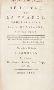 CALONNE (Charles Alexandre de){CR}De l’état de la France présent et à venir. {CR}Londres (et Paris) : Laurent, Octobre 1790. — In-8, (1 f.), xvj, 96 pp., pp. 81bis-96bis, pp. 97-126, pp. 119bis-126bis, pp. 127-440. Demi-maroquin rouge à...