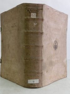 bois, dos à nerfs, titre et étiquettes manuscrites, large décor à froid de roulettes et filets alternés, marque de l'ordre des jésuites au centre, recouverte d'armes au noir de fumée (maison Wimberger ) traces de fermoirs. Frontispice signé Cornelius Galle, repris des éditions de 1645 et 1671; 4 ff., 903 pp., 57 ff., le dernier bl. Belle reliure de l'époque à large décor poussé à froid.