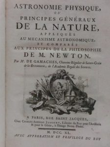 GAMACHES, Etienne Simon de. Astronomie physique ou principes généraux de la nature, appliqués au mécanisme astronomique et comparés aux principes de la philosophie de M. Newton P., Jombert, Paris 1740. E.O. 1 vol In-4, demi-veau du début du...