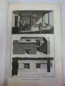 première livraison du premier volume de planches (1762) ; Fonte de l'or. Texte et 6 pl./ Fonte du plomb. Texte et 3 pl. / Batteur d’or. Texte et 2 pl. / Plombier. Texte et 7 pl. / Laminage. Texte et 12 pl. dont 6 doubles / Potier d’étain. Texte et 9 pl. / Bimbelotier. Ensemble, 42 planches gravées sur cuivre en bel état.