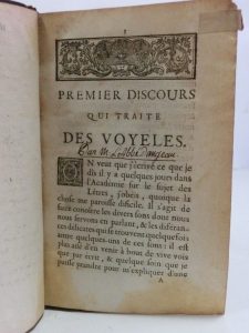 (1643-1723) consacrés à la réforme de la grammaire et de l’orthographe. Premier discours qui traite des voyelles. Sl.n.d., 36 pp. / Second discours qui traite des consones. 24 pp. / Lètre sur l'ortografe, écrite en 1694. 14 pp. / Remarques sur l'orthographe. 13 pp.. / Suite des essais de grammaire. 51 pp. / Sur l'ortografe françoise. 20 pp. / Des Principales parties du discours. 14 pp.. / Des Parties du verbe. 64 pp. / Sur la comparaison de la langue françoise avec les autres langues. 3 pp. / Considérations sur les diverses manières de conjuguer des Grecs, des Latins, des François..., &c. 23 pp. / Des Particules. 11 pp. / Des prépositions. 11 pp. / Sur la préposition après. 4 pp. / Sur le mot quelque. 5 pp.. /Sur le mot quelqu'un. 3 pp. / Utilité de la table du verbe canto. 23 pp..