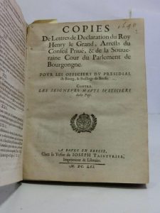 déclaré n'avoir entendu introduire l'impost du sel en Bourgongne. Registré au Parlement le quatrième mars 1663. S d. [1663], 4 pp. - Extraict des registres de Parlement. Sur les désordres des monastères et maisons religieuses de Bourgogne. S. d. [1667], 8 pp. - Déclaration du Roy, portant ban et arrière-ban : à tous nobles, barons, chevaliers, escuyers, vassaux & autres tenans de nous les fiefs & arrière-fiefs sujets à notre ban & arrière-ban, de nostre province de Bourgongne & Bresse, qu'ils ayent toutes excuses cessantes, & sur peine de saisie & confiscations de leursdits fiefs, à se mettre en armes, monter & équiper selon qu'ils sont tenus & obligez de faire pour nostre service. Dijon, Antoine Michard, Sd. [1674], 4 pp. - Déclaration du Roy contre ceux de la religion prétenduë réformée : portant défense de sortir du Royaume. Dijon, Jean Grangier, 1682, 3 pp. Etc., liste complète sur demande.