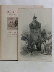 ROBIDA (Albert). 1 dessin original. Rothenburg, une ville du passé. Texte et illustrations par Albert Robida. P., Richardin, 1910. 1 vol. in-4, 1 vol. in-4, broché sous couverture imprimée rempliée. 14 eaux-fortes originales hors texte et...