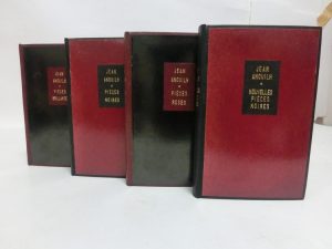 ANOUILH, Jean. Les Quatre Pièces. Pièces Noires ; Pièces roses ; Pièces brillantes. Nouvelles pièces noires. Paris, Calmann-Lévy, 1945 pour les deux premiers et P. La table ronde, 1946 pour les autres. 4 vol. plein maroquin dos lisse, titre...