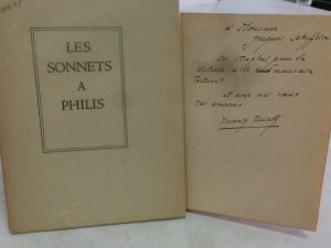 MUSELLI, Vincent. Les sonnets à Philis. P, Pouterman, 1930. E.O. 1 vol, in-4, broché couverture rempliée imprimée. L'un des 5 ex. sur vieux japon à la forme (2° état du tirage) ici le numéro V. Envoi de l'auteur « à Jacques Schiffrin....