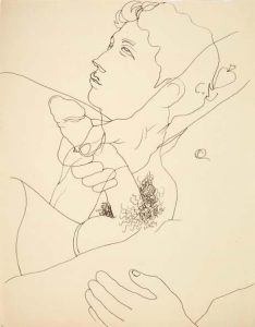 Cocteau (Jean). Dessin érotique. Sans lieu ni date. Dessin original, plume et encre noire (27,5 x 21 cm). Beau dessin érotique représentant une scène de masturbation.