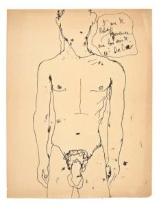 Cocteau (Jean). Dessin érotique. Sans lieu ni date. Dessin original, plume et encre noire (27 x 21 cm). Remarquable nu masculin, accompagné de l’inscription autographe “5 rue de Robert Provence aux bons soins de Mr De Crei (?)”. Pliure centrale.