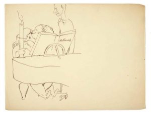 Cocteau (Jean). Dessin original. Sans lieu ni date. Dessin original, plume et encre brune sur papier pelure (21 x 27,5 cm). Remarquable dessin de Cocteau figurant une mère embrassant son enfant devant un piano et une partition portant le titre