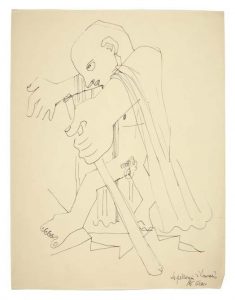 Cocteau (Jean). Le Pellerin d’Emmaüs. Sans lieu ni date. Dessin original signé Jean, avec légende autographe, plume et encre noire (27 x 21 cm). Remarquable dessin original, signé et légendé, illustrant un épisode de l’Evangile : les