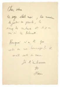 voir et “s’aimer un peu”. Oui mon mal brode et tourne - cherche sa place dans la corbeille.” Suivent toutes les adresses où contacter Cocteau qui renouvelle son invitation. On joint une autre lettre de Jean Cocteau, sans doute au même : “Cher vieux, Le sage était moi, le muséum, le jardin des plantes, les scènes des centaures et le je ne sais où le Potomak. Pourquoi n’as-tu pas voulu de mon hommage ? Il serait sorti du cœur. Je t’embrasse, Jean”.