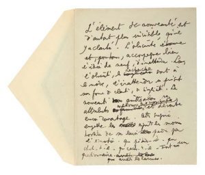 Cocteau (Jean). Sur la nouveauté. Sans lieu ni date. Manuscrit autographe, 1 page in-12 au recto d’une enveloppe. “L’élément de nouveauté est d’autant plus invisible, qu’il....