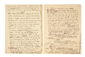 Cocteau (Jean). Brouillon autographe relatif à la Machine infernale. Sans lieu ni date [1934]. Manuscrit autographe, avec ratures et corrections, de 2 pages in-4. Intéressante ébauche autographe offrant des réflexions théoriques sur la Machine......