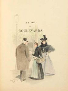 couvertures illustrées conservées (reliure de l’époque). Première édition, tirée à 800 exemplaires. Un des 100 exemplaires numérotés sur Japon Impérial, seul grand papier. Ravissant livre illustré de 200 compositions en couleurs dans le texte de Pierre Vidal illustrant la vie agitée des boulevards, de jour comme de nuit : La Madeleine, grandes et petites boutiques, le camelot, cochers et voitures, les cafés et restaurants, l’étranger au boulevard, les femmes du boulevard, les théâtres, les petites Cythères, la place de la République, le boulevard du crime, la Bastille... Exemplaire enrichi d’une aquarelle originale de Pierre Vidal sur le faux titre. On a également relié avec deux tirages de la couverture avant la lettre, en noir et en couleurs. Reliure de l’époque, au dos peint. Elle est usagée par endroits. Ex-libris H. Lebaudy. (Berkvam, La Vie parisienne, Bloomington, 1981, nº 3 : “superbly illustrated by Vidal’s color drawings”.)