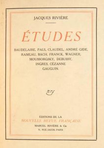 conservées (Marot-Rodde). Edition originale du premier livre de Jacques Rivière, l’une des chevilles ouvrières de la N.R.F. Un des 15 exemplaires réimposés au format in-4 sur vergé d’Arches (n° 4), seul grand papier. Ces études dédiées à l’ami et beau-frère de l’auteur, Alain-Fournier, portent aussi bien sur des peintres que sur des écrivains ou des musiciens : Baudelaire, Cézanne, Gauguin, Claudel, Ravel, Debussy, André Gide, etc. C’est l’un des premiers livres publiés par les éditions de la Nrf fondées la même année dont le logo encore malhabile est imprimé sur la couverture. Belle reliure Art déco de Marot-Rodde. (Vignes et Boudrot, Bibliographie des éditions de la Nrf, n° 12.)