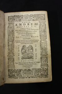 Alciat (André) : Emblemata. Paris, Marnef, 1583, in-8 veau brun, médaille dorée sur les plats. (Adams-Rawles-057). Reliure usagée (mors fendus, coiffes arrachées, coins usés).