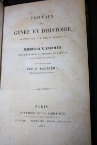 Barriere (F.) :Tableaux de Genre et d'Histoire peints par différents maîtres, ou Morceaux inédits sur la Régence, la jeunesse de Louis XV et le règne de Louis XIV.Paris, 1 828, in-8 dos veau vert foncé.