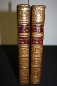 Demosthene : Opera. Graece et Latine. Edition par Joannes Taylor. Cambridge Impensis Danielis Prince, Oxoniae et Joannes Woodyer, Camtabrigiae, 1769, 2 vol. in-8 veau blond, tranches dorées. Edition gréco-latine fort bien imprimée. Très bel...