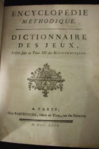Dictionnaire des Jeux. Encyclopédie méthodique. Paris, Panckoucke, 1792, in-4 demi-basane ; 315 pp. 16 pl. Suivi de Dictionnaire des jeux mathématiques, an VII (1799) 212 pp. Suivi de Dictionnaire des jeux familiers ; an V (1797). Absence de 2 ff....