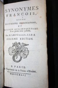Girard :Synonymes françois. Paris, d'Houry, 1742, in-12 basane fauve. Macules et Grafitti.
